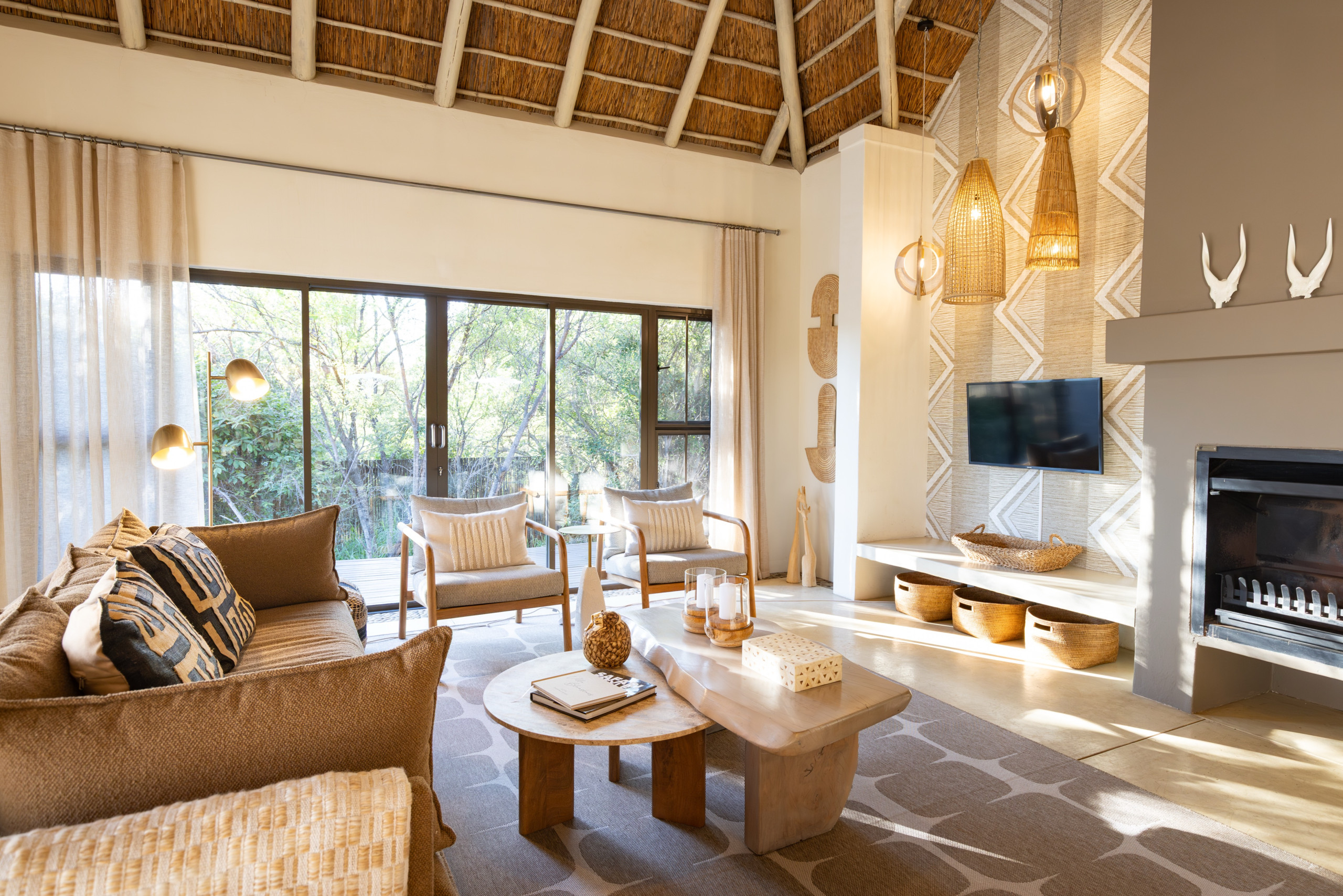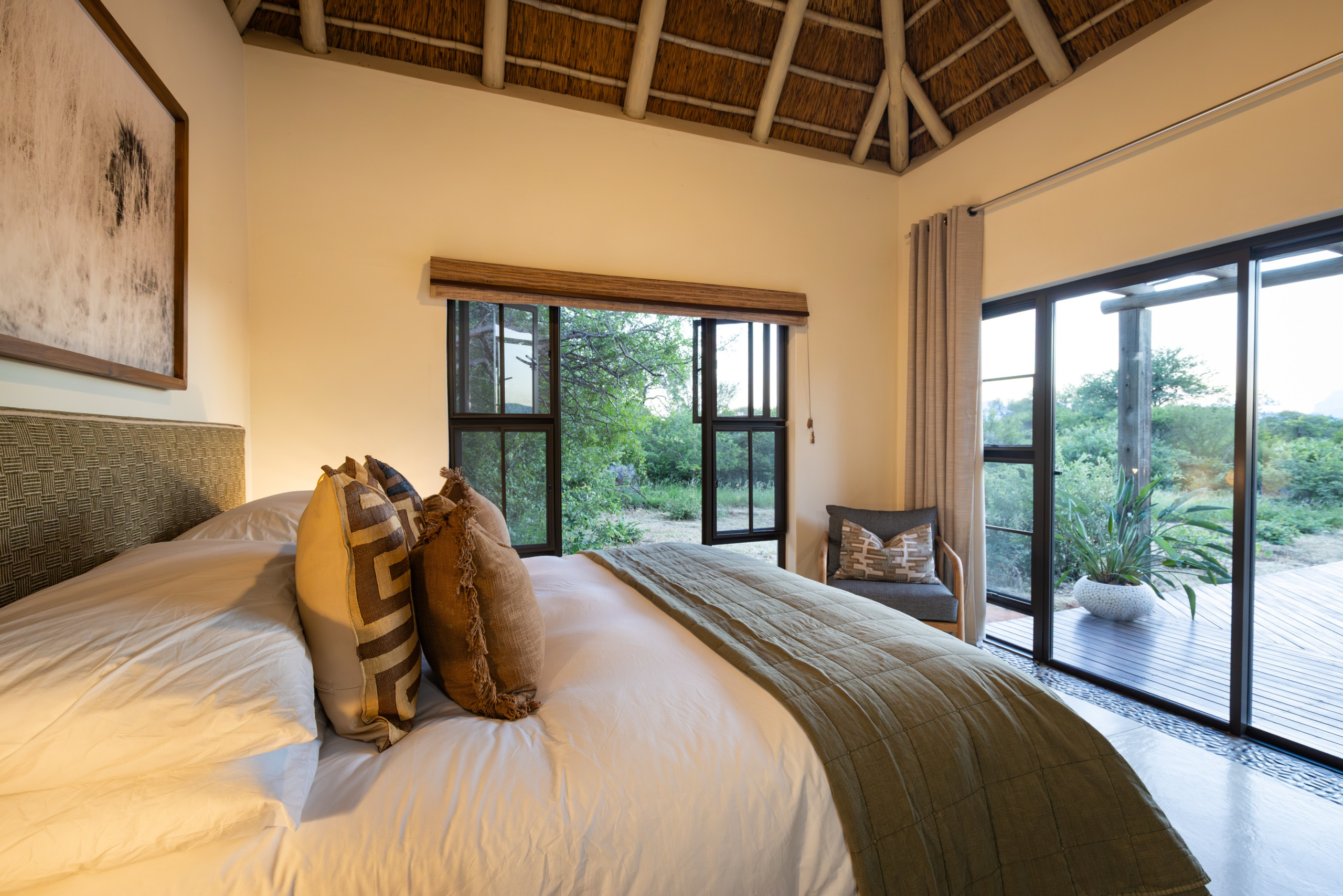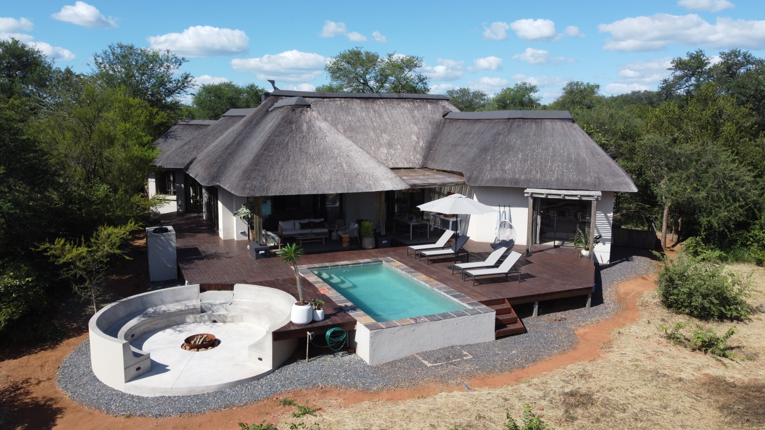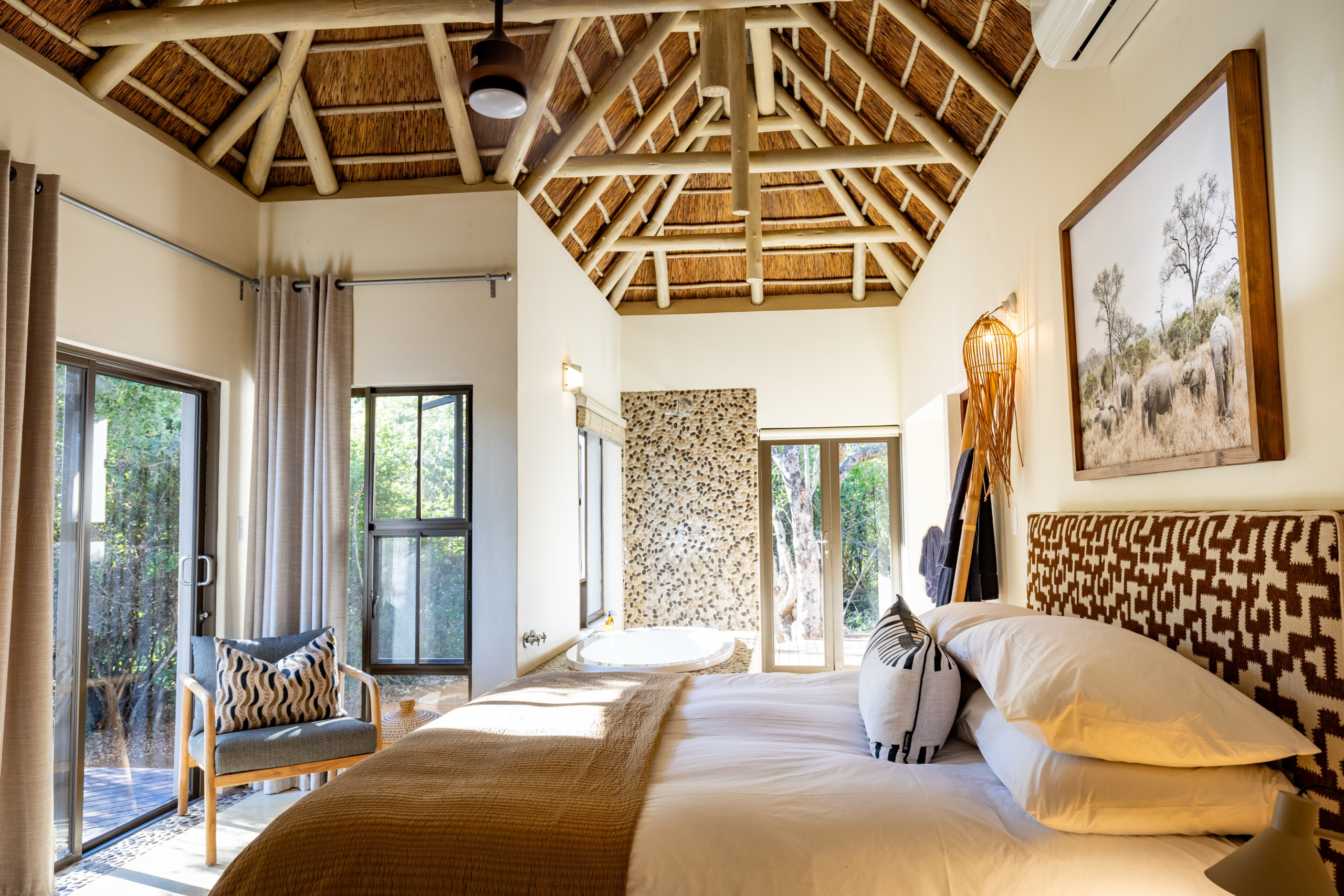 Treten Sie ein und fühlen Sie sich sofort wie zu Hause. Die Villa verfügt über drei großzügige Schlafzimmer, alle mit Klimaanlage und Ventilatoren – ideal für erholsame Nickerchen und ruhige Nächte. Es gibt zwei moderne Badezimmer, eines davon mit Badewanne, sowie erfrischende Außenduschen, perfekt nach einem warmen Tag im Busch.