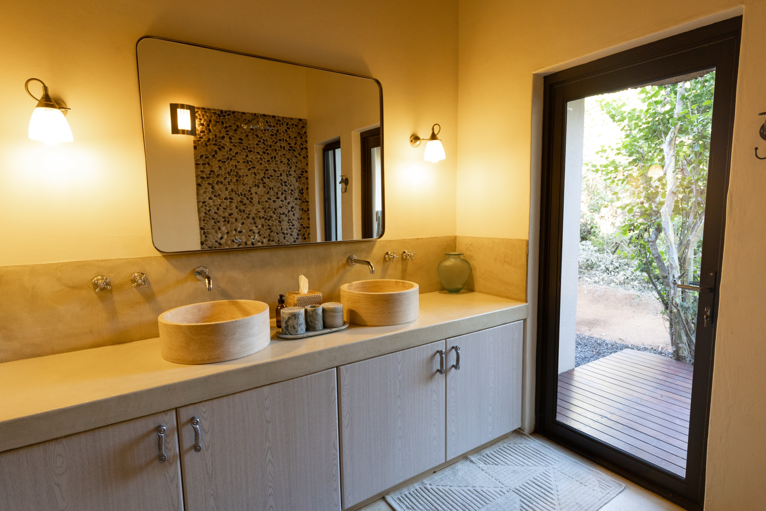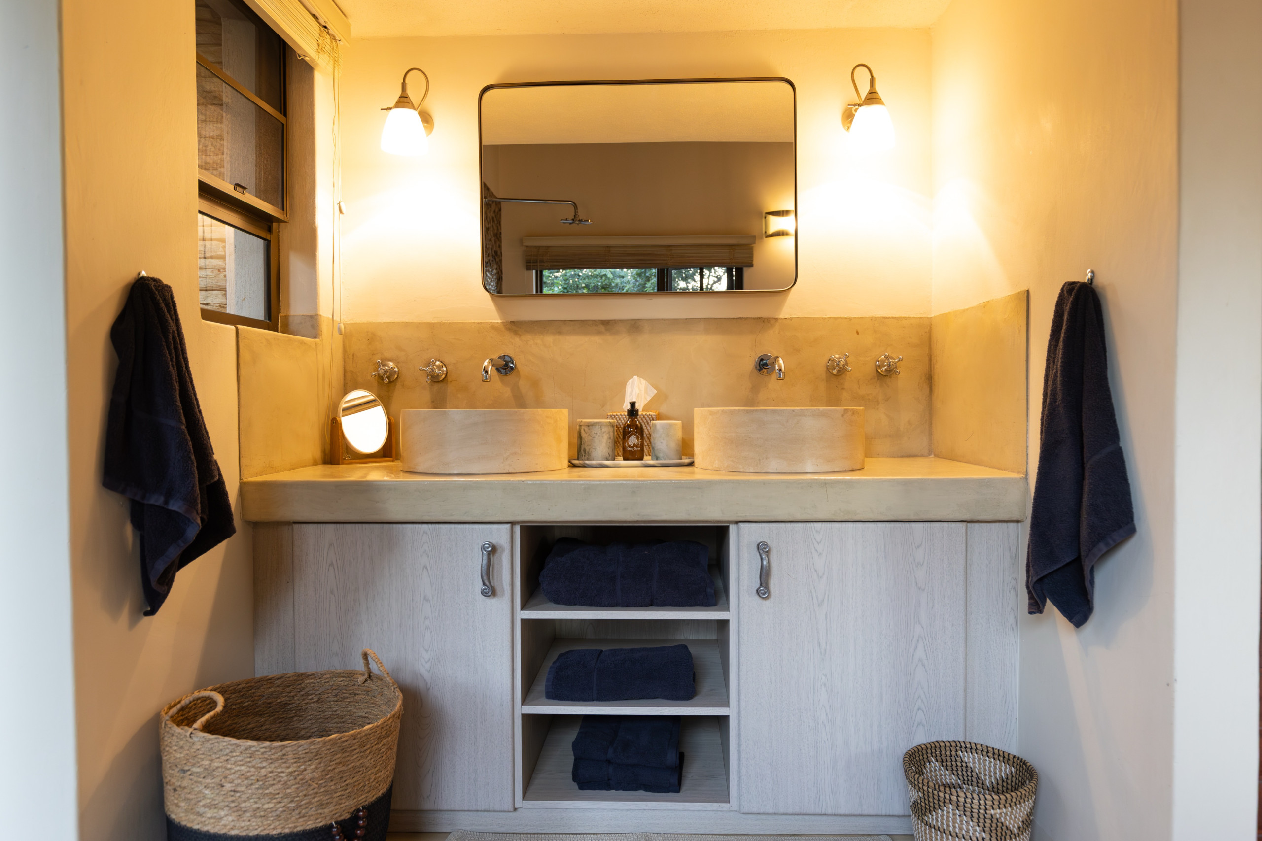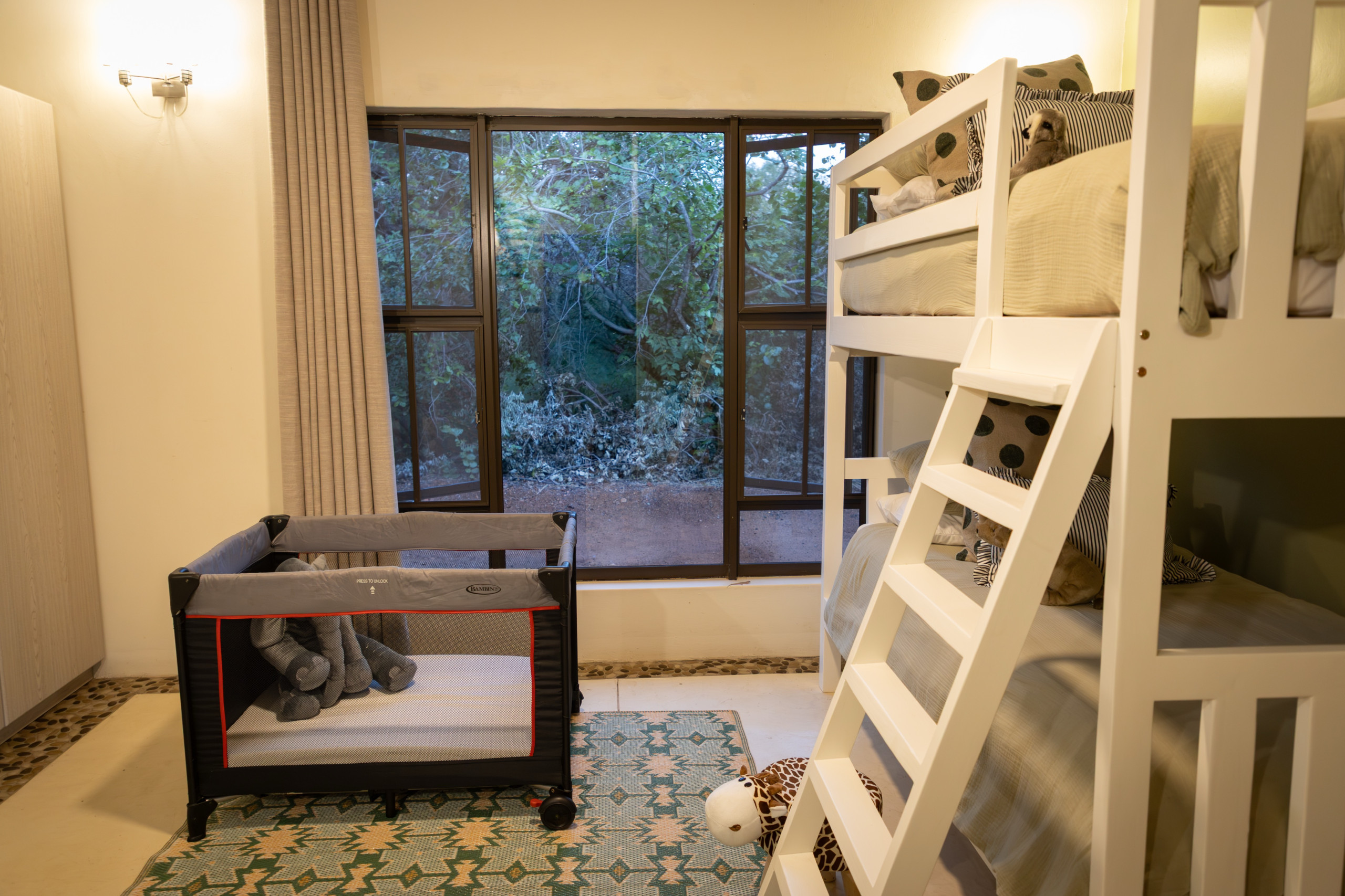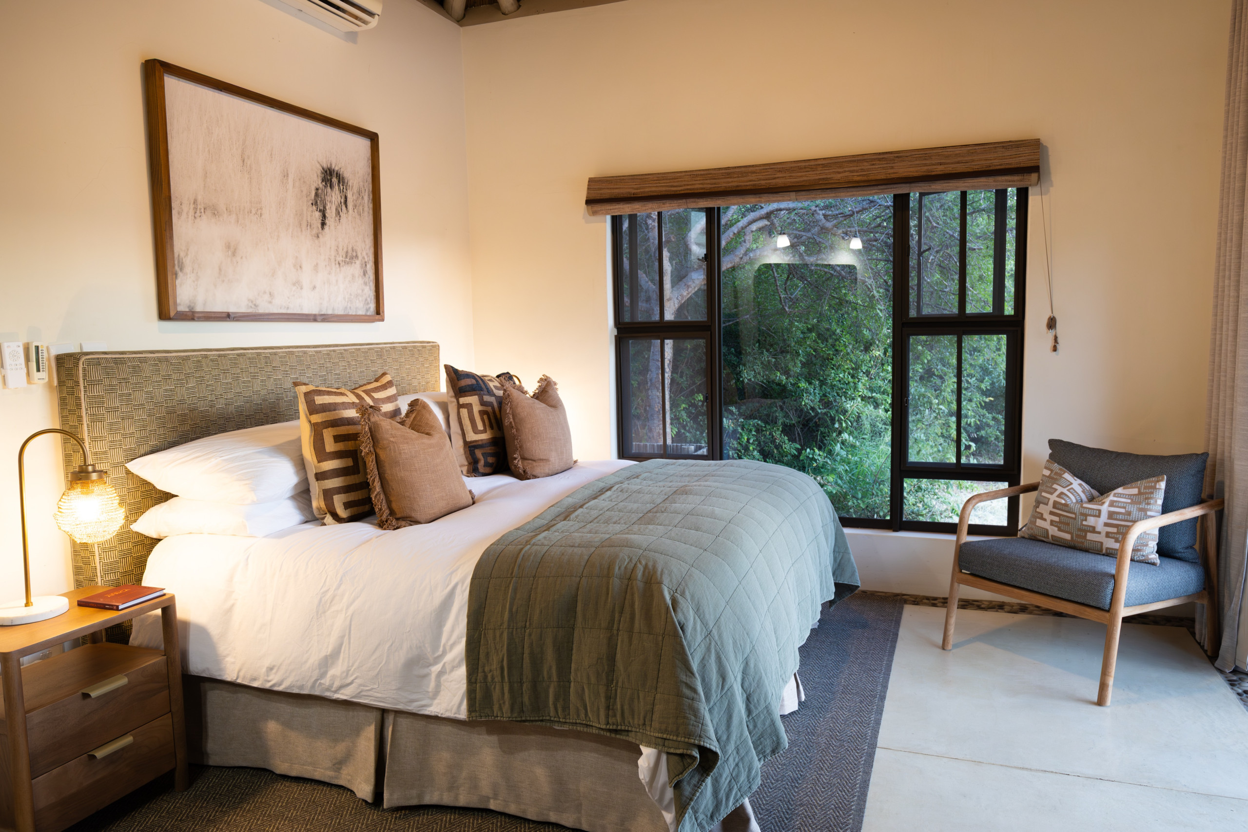 Treten Sie ein und fühlen Sie sich sofort wie zu Hause. Die Villa verfügt über drei großzügige Schlafzimmer, alle mit Klimaanlage und Ventilatoren – ideal für erholsame Nickerchen und ruhige Nächte. Es gibt zwei moderne Badezimmer, eines davon mit Badewanne, sowie erfrischende Außenduschen, perfekt nach einem warmen Tag im Busch.