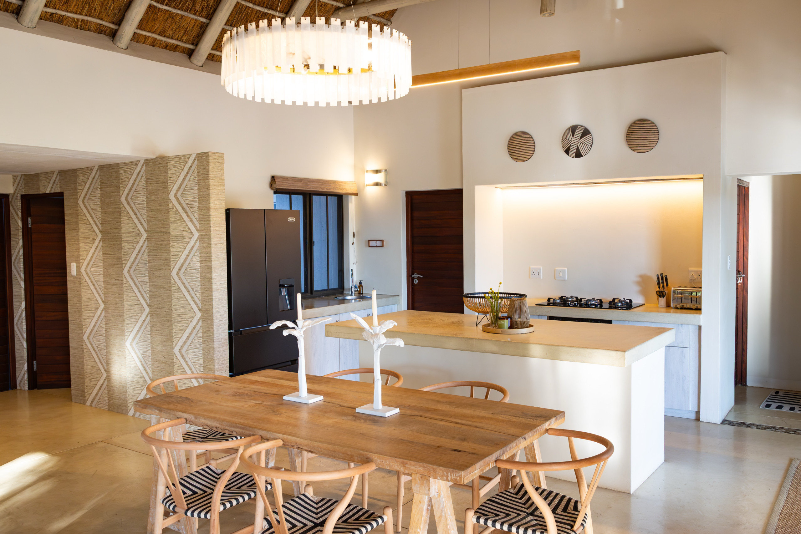 Das Herzstück der Villa ist der helle, gesellige Wohnbereich mit einem großen Esstisch im Innenraum und einem weiteren auf der Terrasse – perfekt für lange, entspannte Familienmahlzeiten. Der Außenbereich ist ein echtes Highlight: ein privater, beheizter Pool, in dem Kinder planschen können, ein traditioneller südafrikanischer Braai (Grill) und eine wunderschön gelegene Boma-Feuerstelle – ideal für Geschichten unter dem Sternenhimmel.
