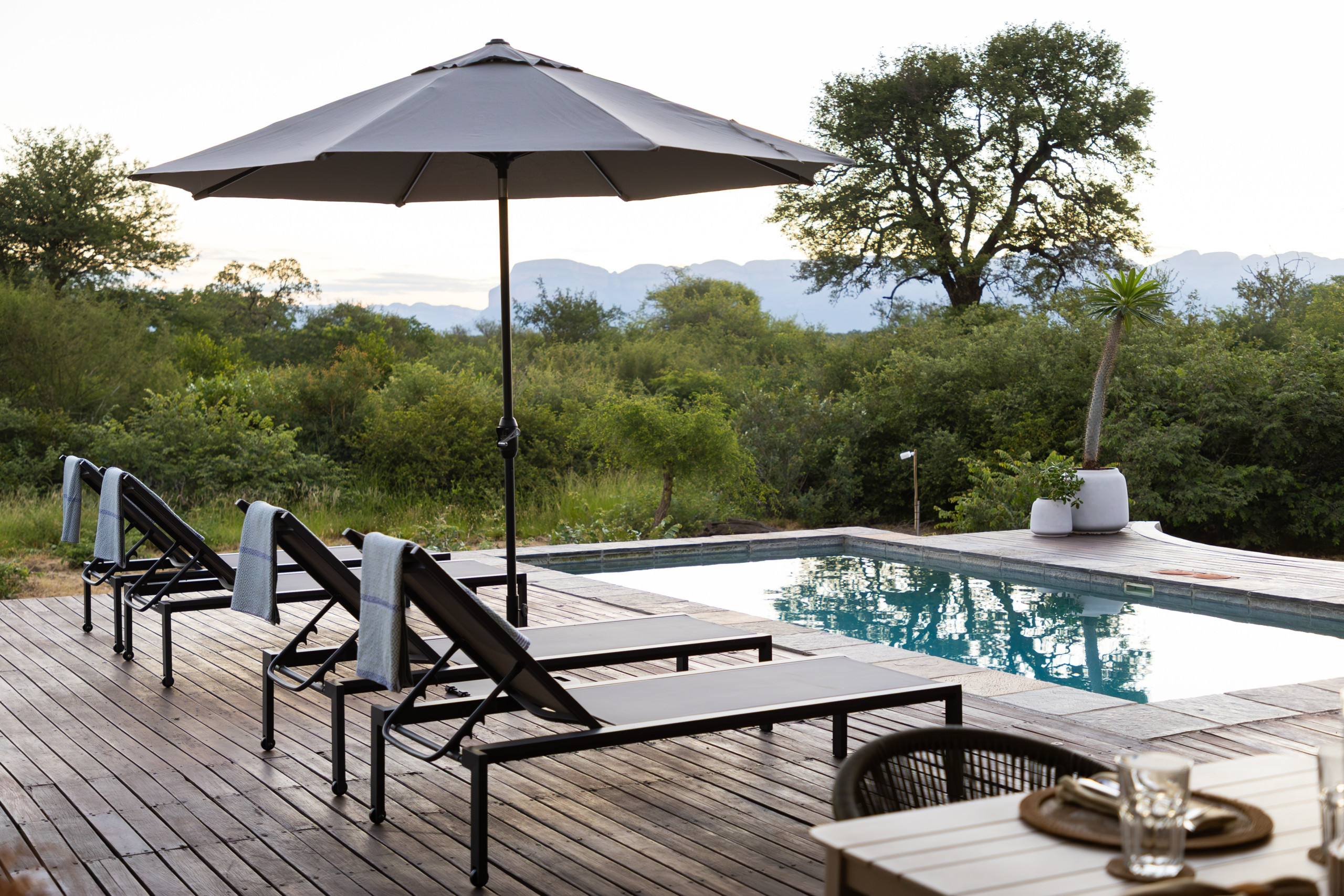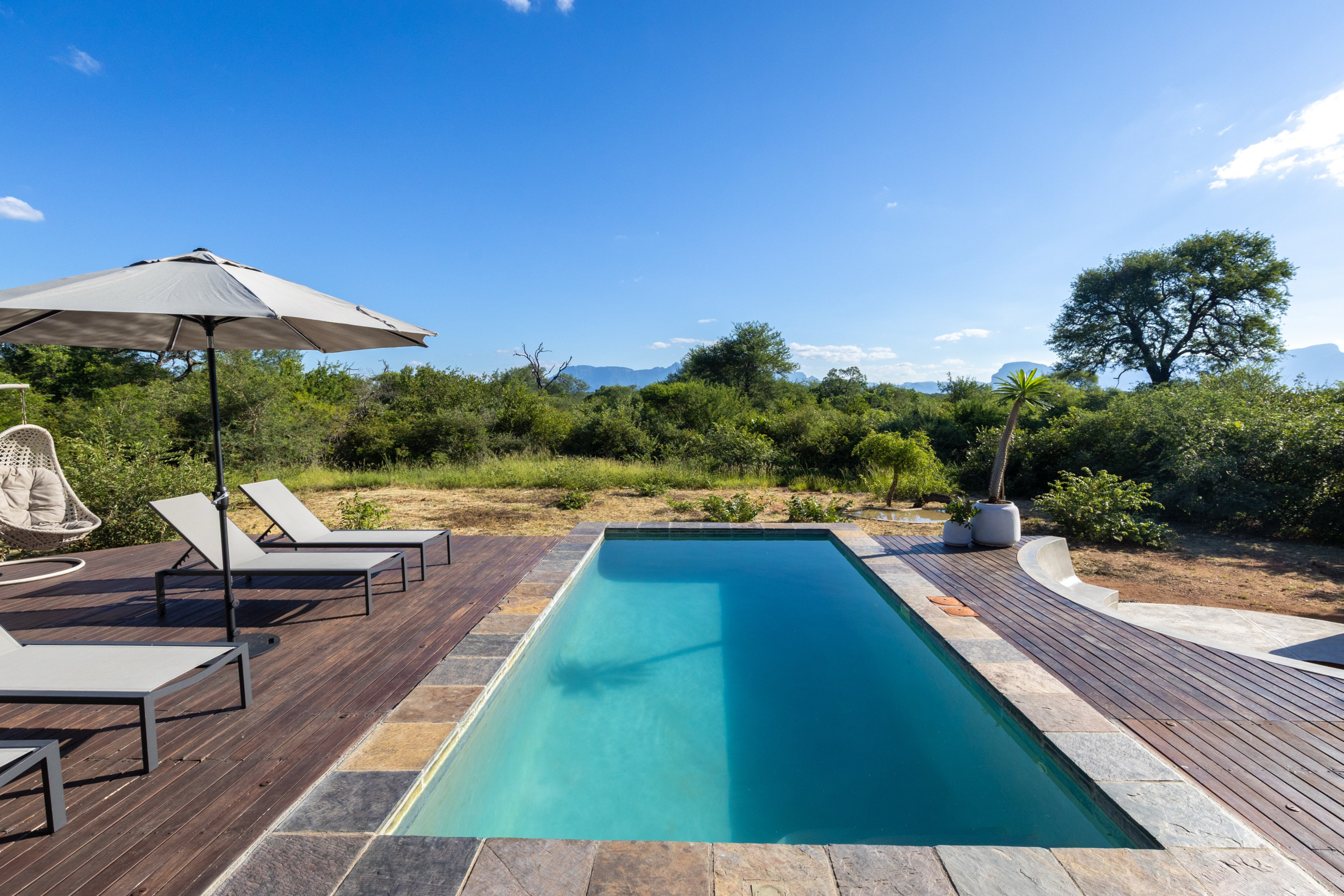 Wenn Sie nach draußen gehen, werden Sie von der von Bäumen umgebenen Villa begrüßt. Auf der teilweise überdachten Terrasse gibt es einen Essbereich sowie bequeme Sofas, auf denen Sie am Ende eines jeden Tages sitzen und den Sonnenuntergang genießen können. Der private beheizte Pool mit Martini-Stufe lädt Sie ein, Ihre Tage im Pool zu verbringen und dabei ein Weber-BBQ zu genießen. Und das ist noch nicht alles: Zusätzlich zum Außenbereich gibt es einen traditionellen Feuer-Boma-Bereich, an dem Sie abends ein Lagerfeuer genießen und dabei ein Glas Wein unter dem afrikanischen Himmel genießen können. Privatsphäre ist von größter Bedeutung und an dieser Villa mangelt es nicht, damit Sie sich vollkommen eins mit der Natur fühlen, die Sie umgibt.