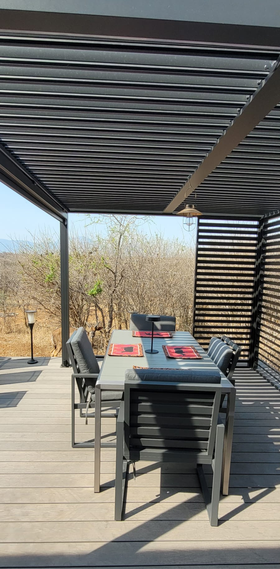 Der private Pool ist beheizt. Die teilweise überdachte, große Terrasse hat 4 Sonnenliegen und ein Lounge-Set. Die schöne Boma neben der Terrasse ist der ideale Ort, um den südafrikanischen Sternenhimmel und die weite Aussicht am Abend zu genießen.