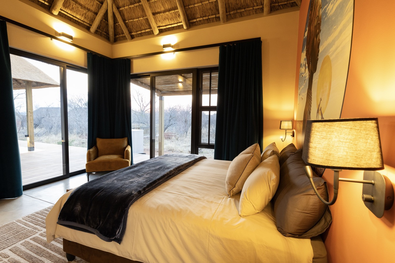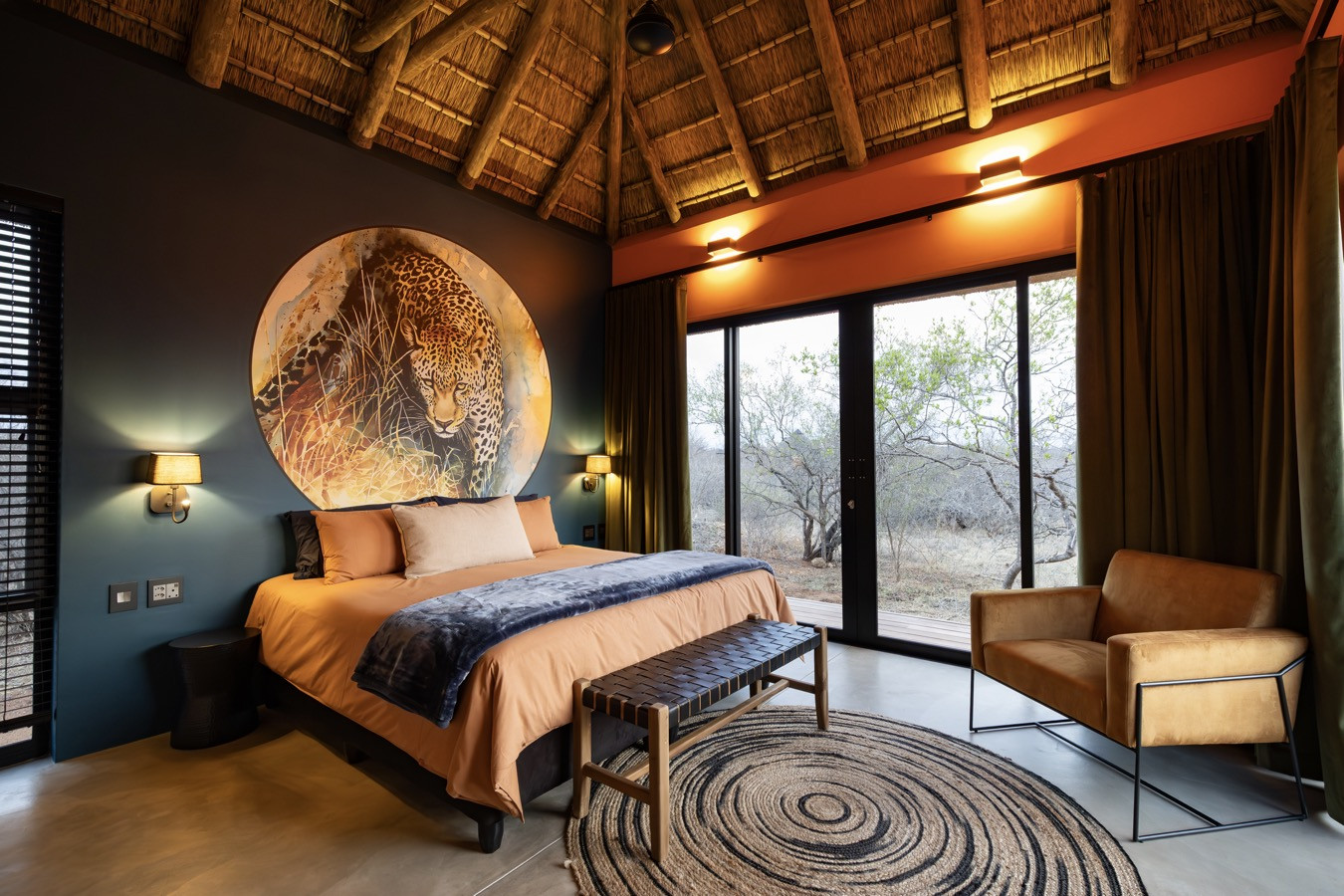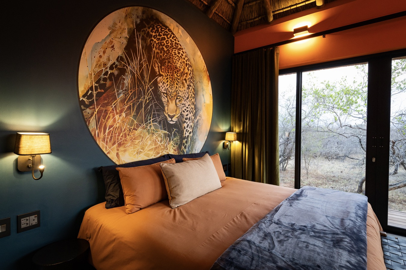Die Schlafzimmer verfügen über einzigartige, künstlerische Details, die Ihnen das Gefühl geben, mitten im Busch zu sein – während Sie sich auf bequemen Boxspringbetten ausruhen.