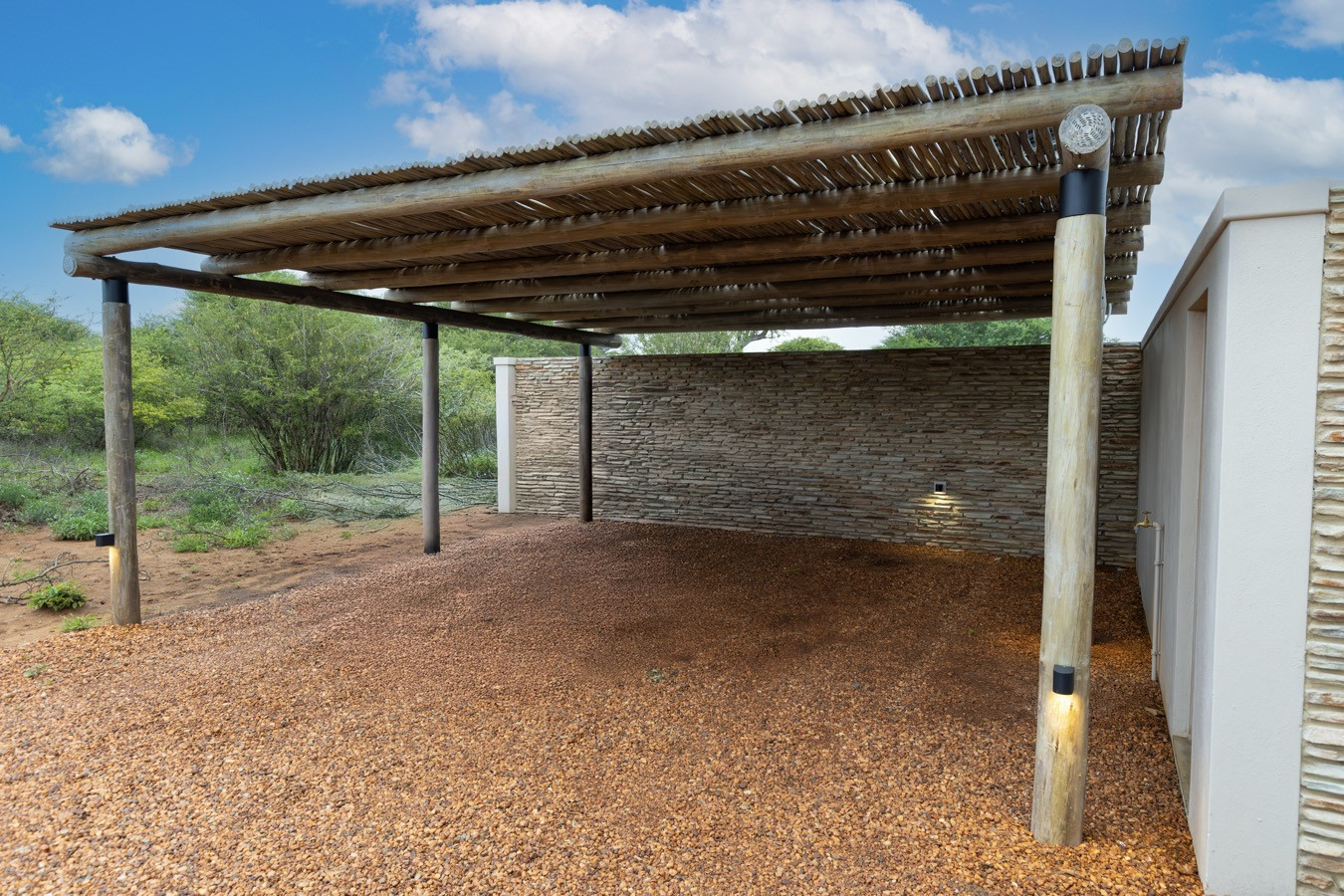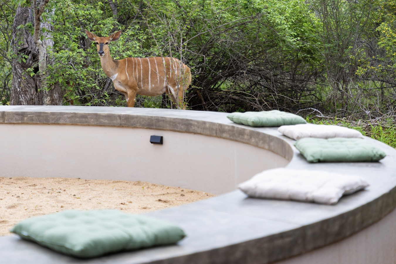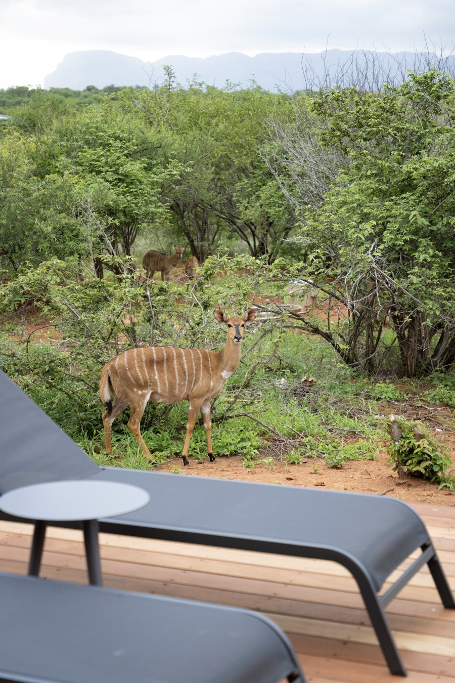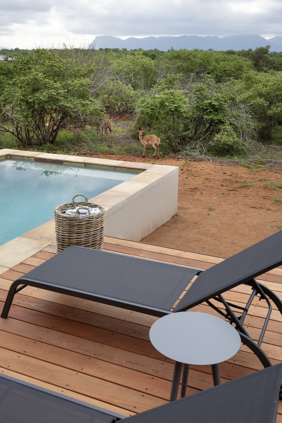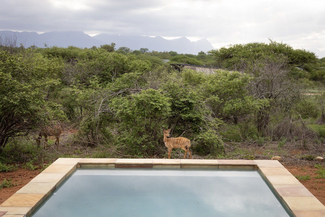 Door de ligging op 10.000 m2 eigen grond is er absolute privacy. Op het terras van 130 m2, waarvan 40m2 overdekt, en vanuit het verwarmde privé-zwembad kun je genieten van het prachtige uitzicht en de regelmatig voorbijkomende, niet gevaarlijke, wilde dieren zoals o.a. giraffen, nyala’s, impala’s, wrattenzwijnen en zebra’s.