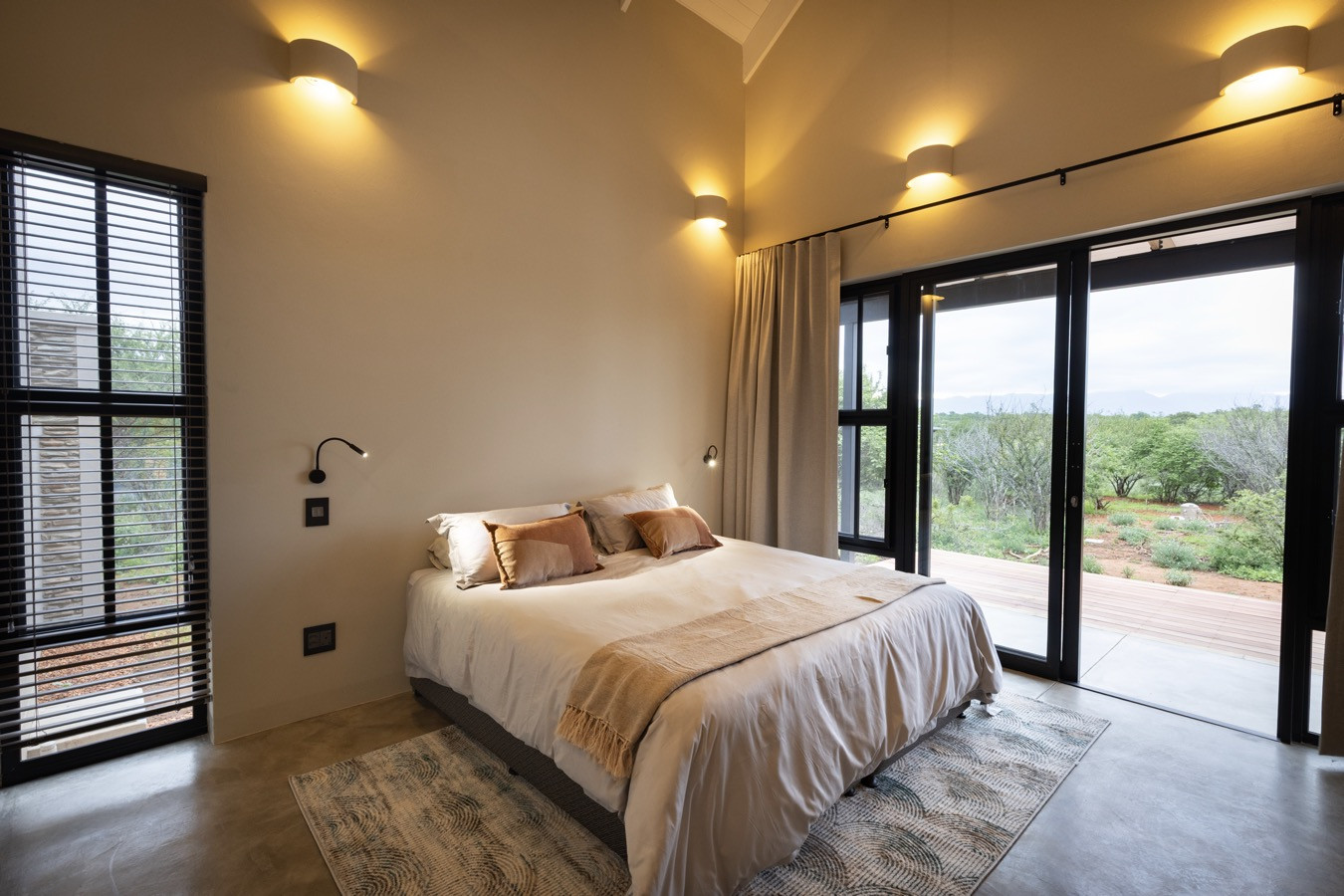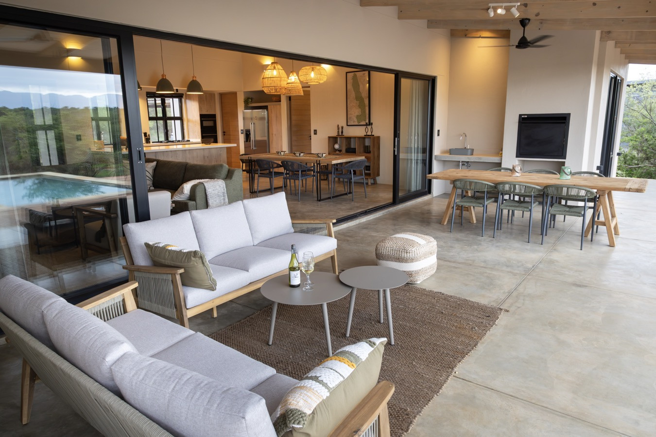Brede schuifdeuren verbinden de woonkamer en twee van de slaapkamers met een ruim terras en patio, met een onbelemmerd uitzicht over de bush en de majestueuze Klein Drakensberg.