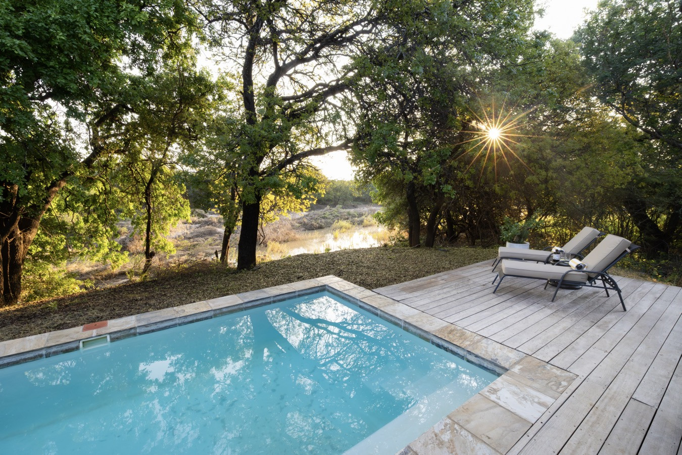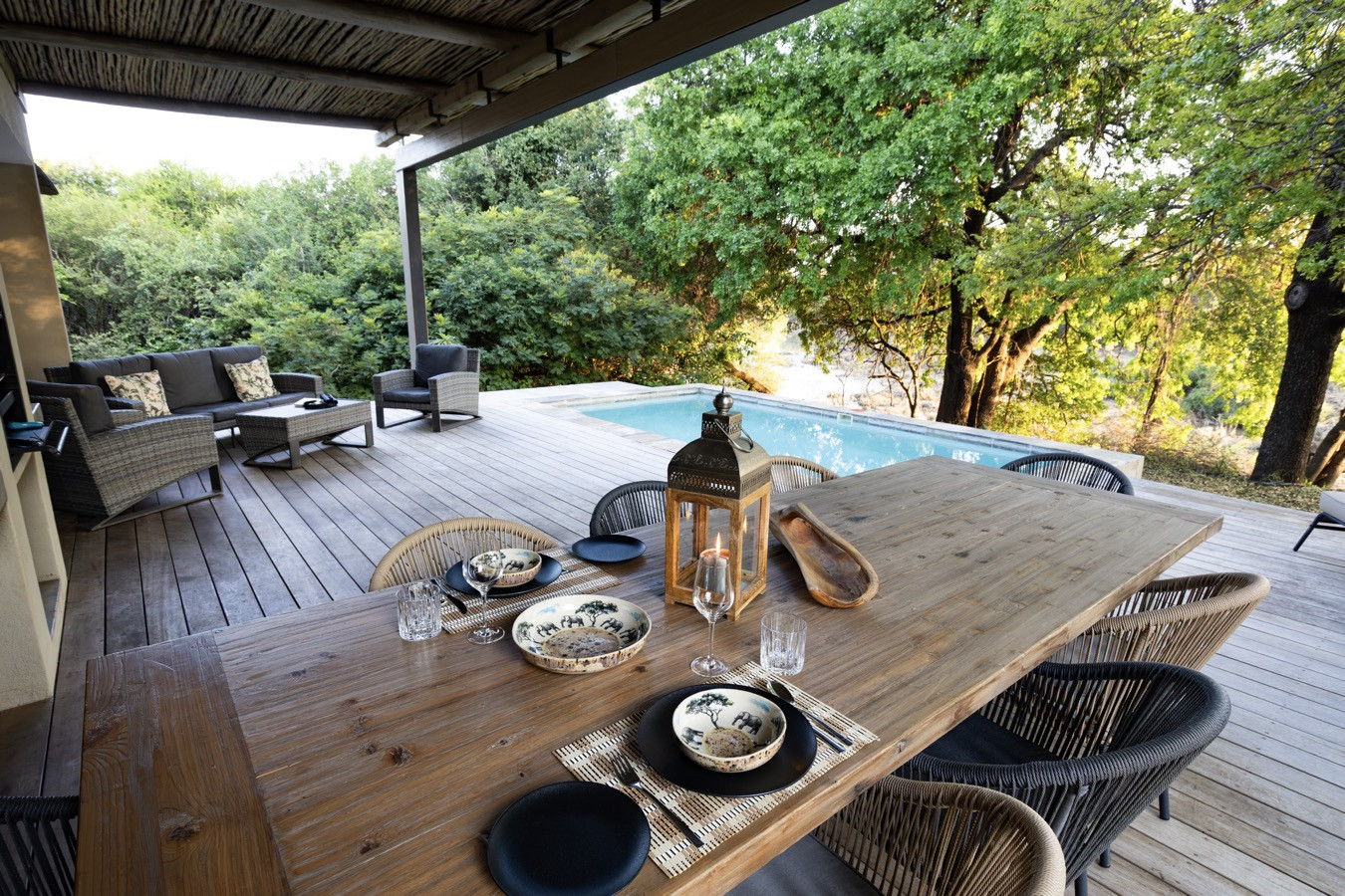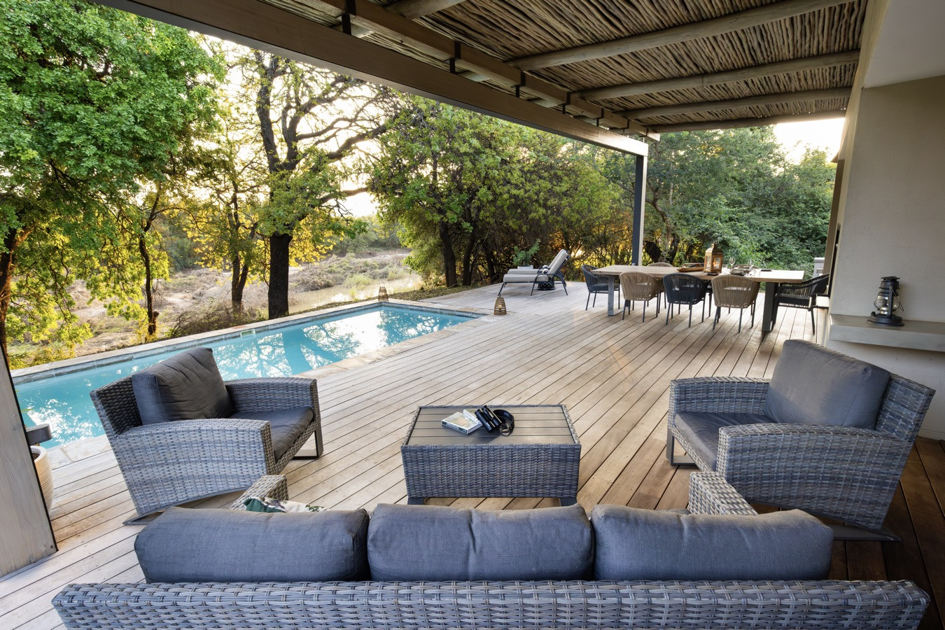 Het privé zwembad is verwarmd. Het deels overdekte ruime terras heeft 4 zonnebedden en een lounge set. De heerlijke boma grenzend aan het terras is de plek om ’s avonds te genieten van de Zuid-Afrikaanse sterrenhemel en het weidse uitzicht.