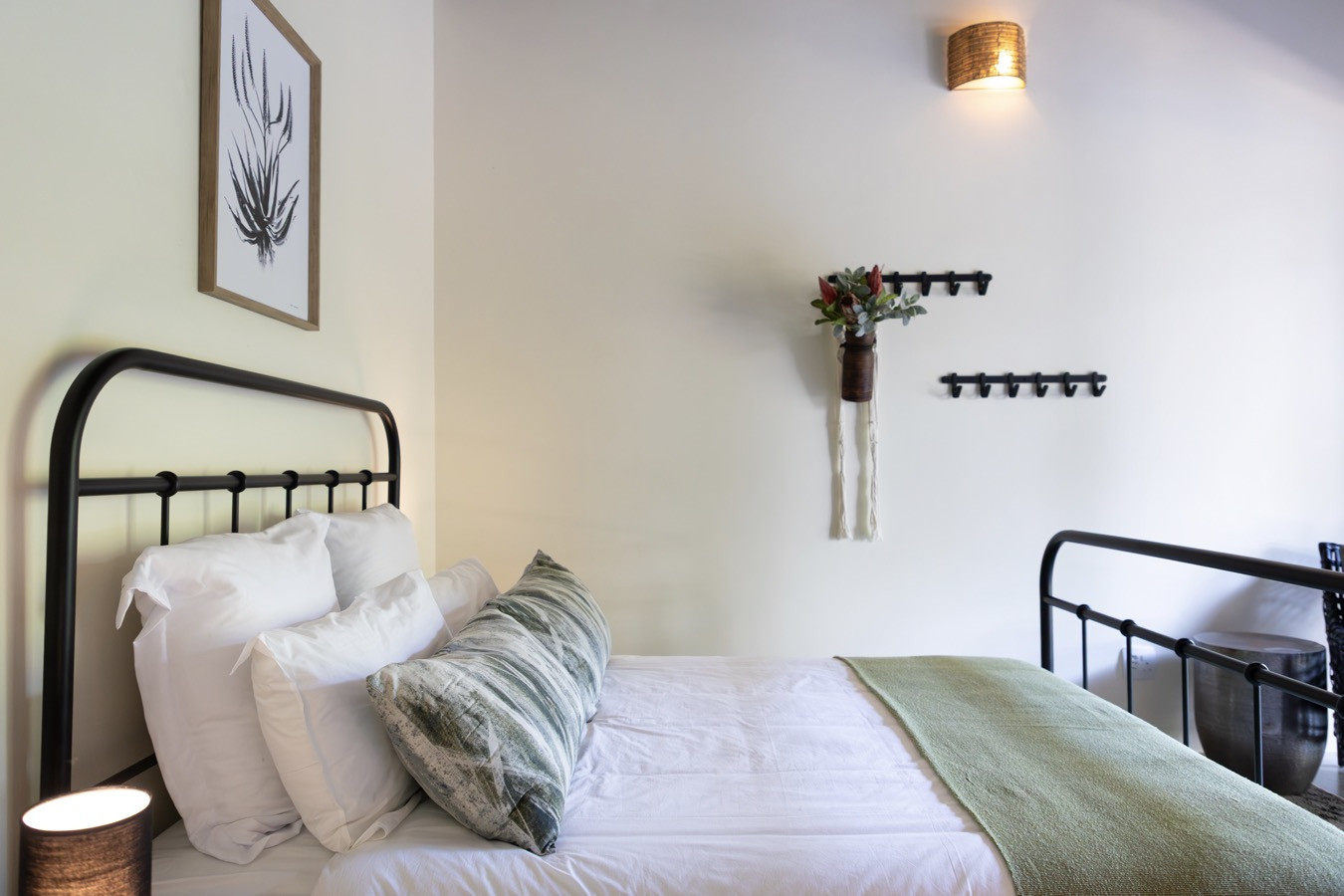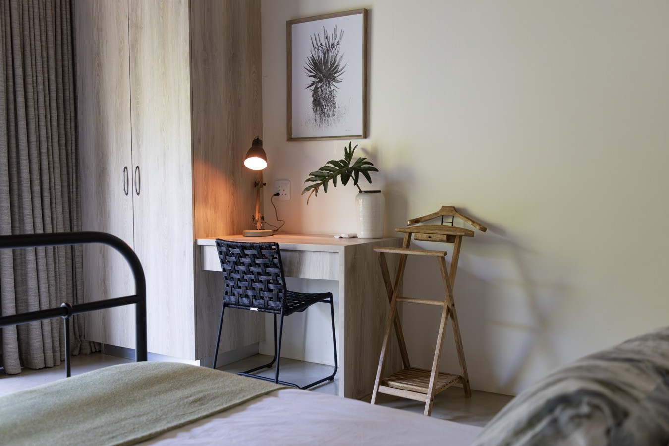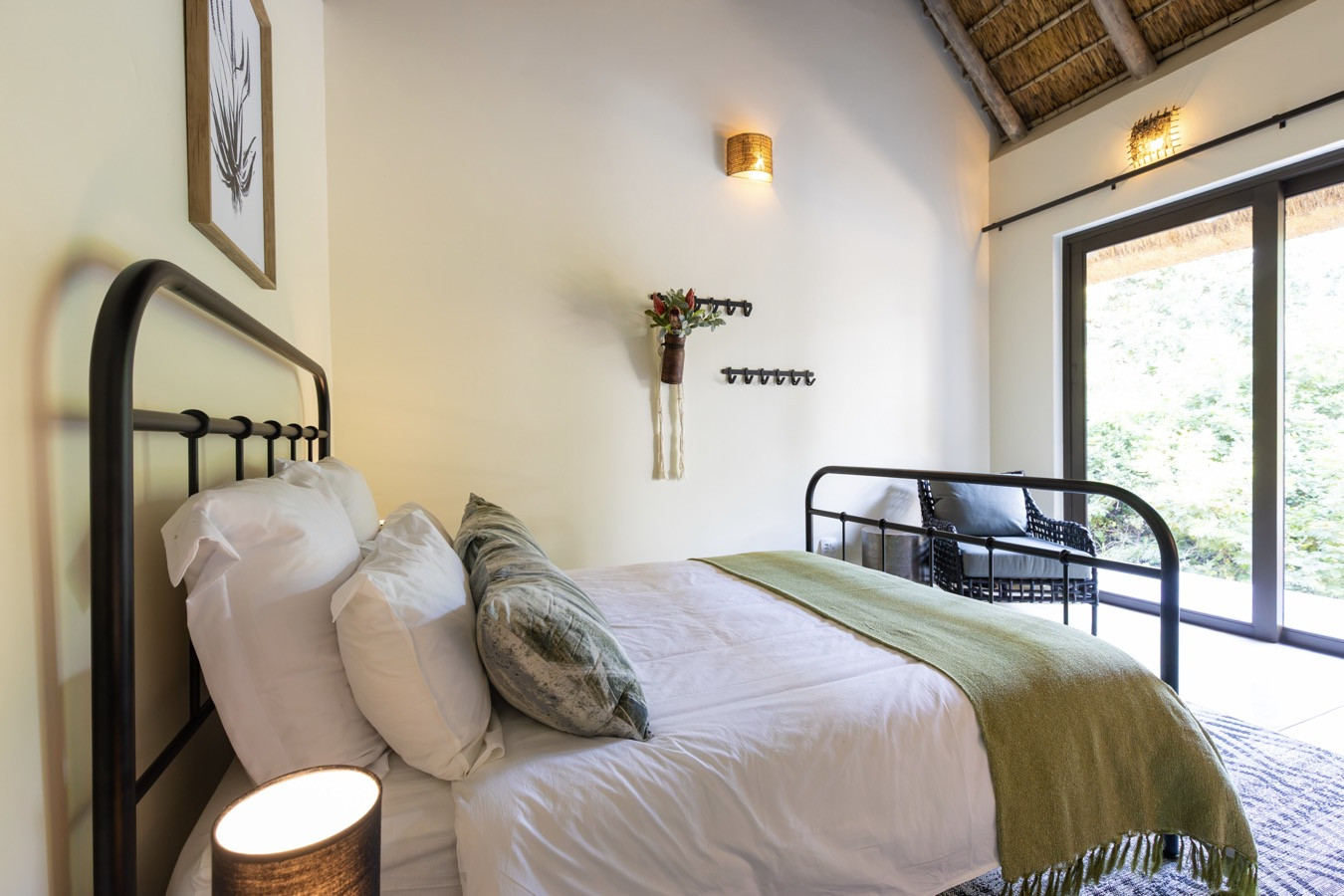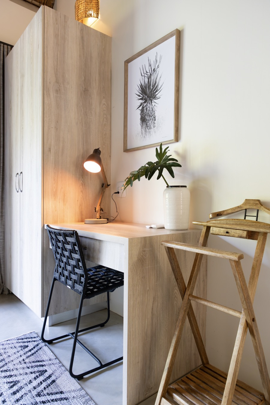 De inrichting is sfeervol en modern Afrikaans en het huis is praktisch van opzet. De twee master bedrooms zijn voorzien van tweepersoonsbedden, een ensuite badkamer met dubbele waskommen en buitendouche. De huiskamer met een heerlijke comfortabele hoekbank grenst direct aan het zonnige terras. De harmonica schuifdeuren kunnen volledig weggeschoven worden waardoor buiten en binnen een geheel vormen