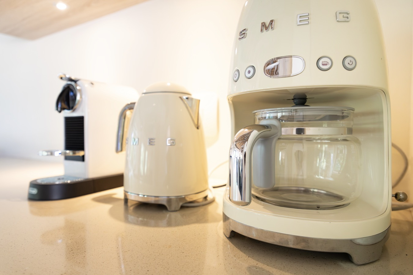 De woonkamer is licht en ruim, met comfortabele zitmeubels en een warme, uitnodigende sfeer. De moderne open keuken, compleet met alle benodigde apparatuur - waaronder een afwasmachine, oven, magnetron, warmhoudlade en een vijfpits gasfornuis - sluit naadloos aan op de woonkamer. Met een dubbele koelkast is er meer dan genoeg ruimte voor gekoelde dranken en lekkernijen. Zowel een Nespresso-apparaat als een drip koffiezetapparaat zijn aanwezig. Op koelere avonden kun je de open haard aansteken voor extra gezelligheid.