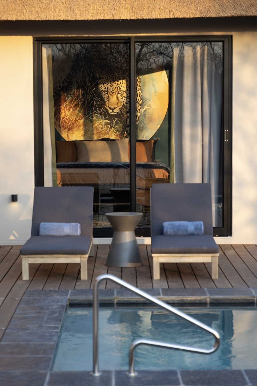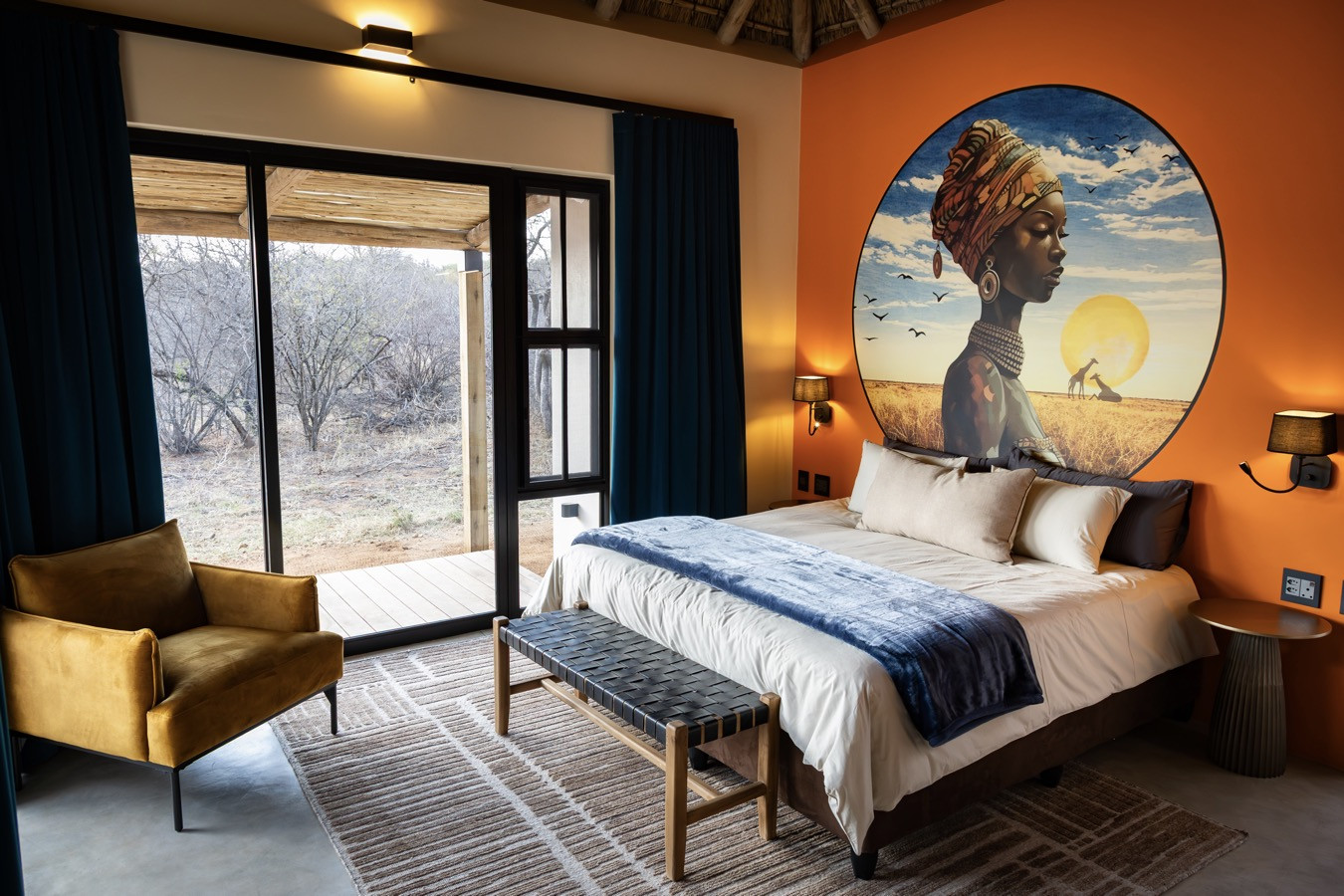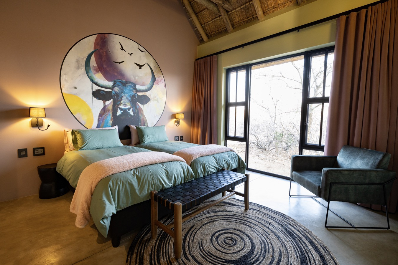 The bedrooms are decorated with artistic elements inspired by the bushveld, giving you the feeling of sleeping right in the heart of nature — all while enjoying the comfort of luxurious boxspring beds.