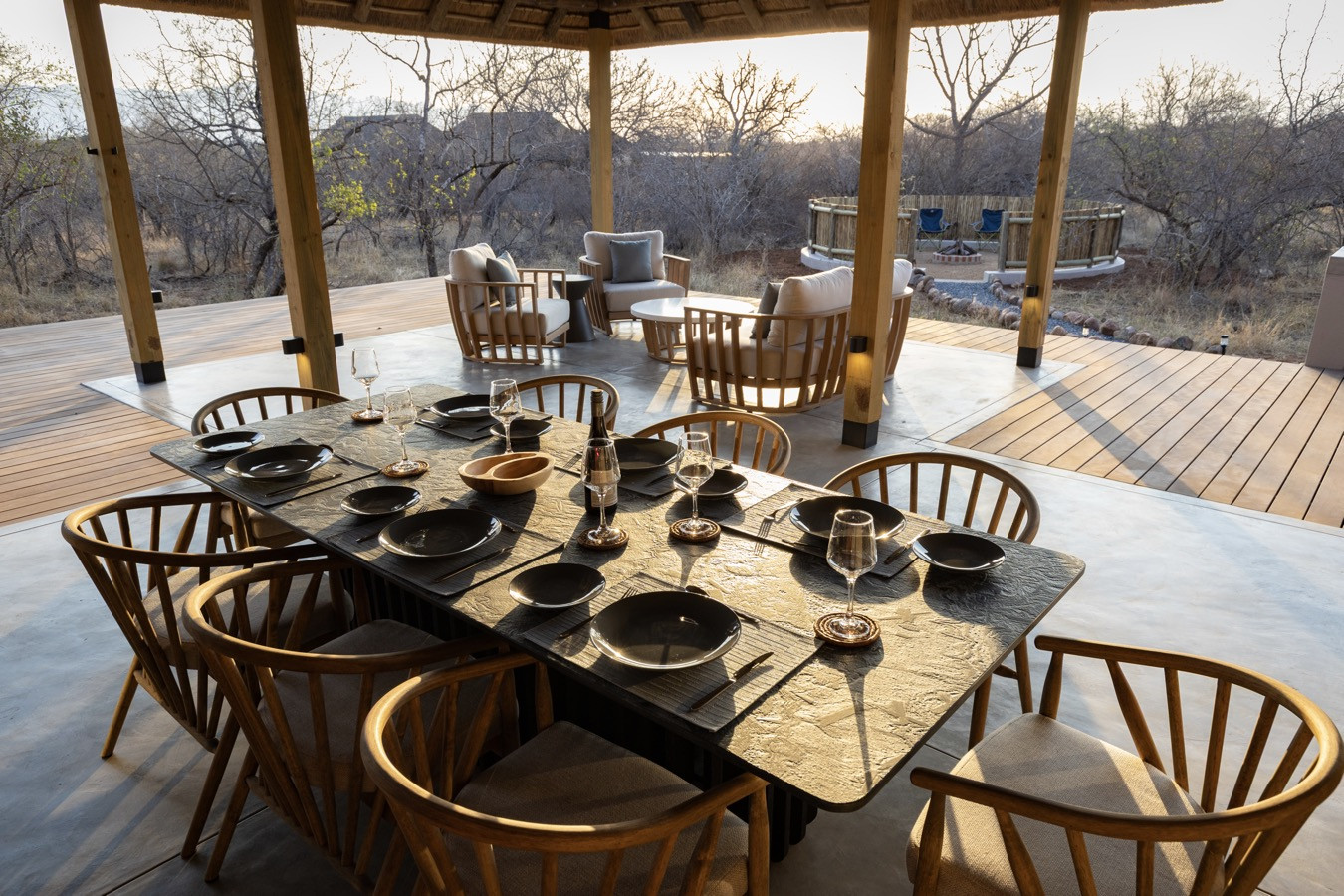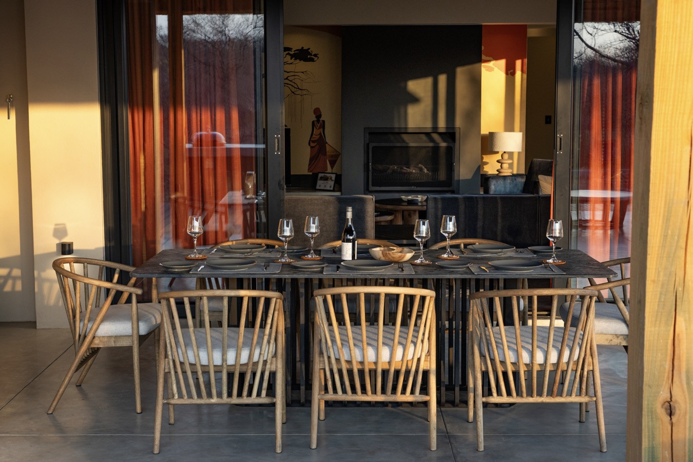 The spacious, partly covered patio connects the living area and bedrooms and features a large dining table — ideal for meals prepared by a private chef, one of the highly recommended experiences offered by Homes of Africa.