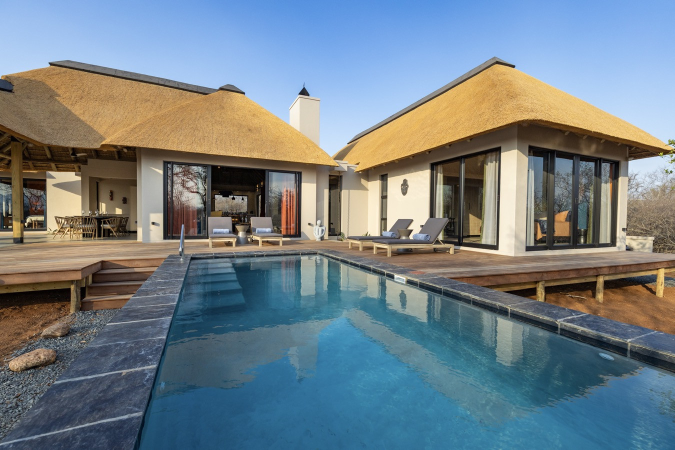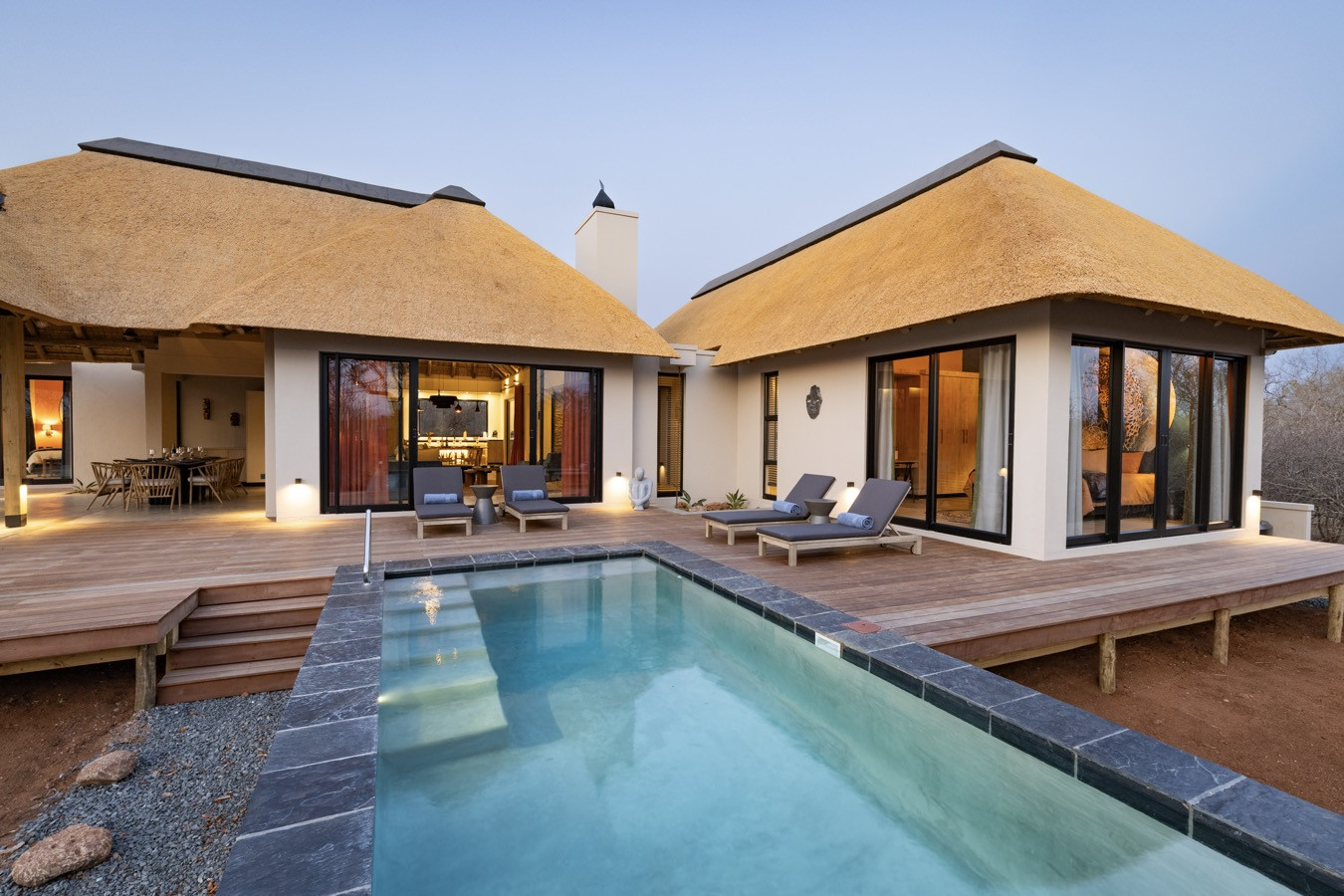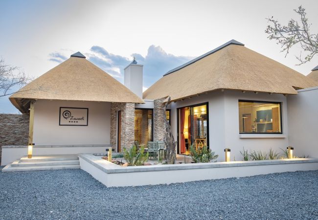 Near Hoedspruit, the safari capital of South Africa, on a private game reserve surrounded by African bush and with a beautiful view of the Little Drakensberg is the luxurious and attractive thatched Villa Bushman. With a recent restyle this villa now boasts a refreshing African flair that all our guests enjoy.